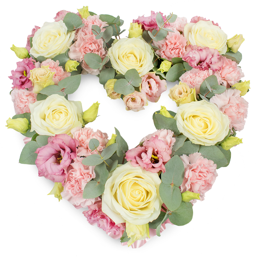 Honor a loved one with our Sophisticated Heart Tribute Bouquet, an elegant arrangement that combines white roses, pink carnations, delicate pink lisianthus, and fragrant eucalyptus. Each flower is hand-picked to ensure premium quality and lasting freshness.